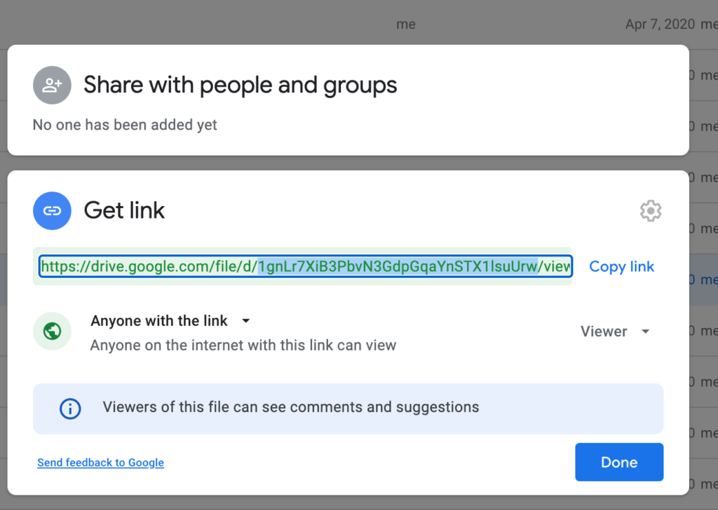 1. Get the unique ID of the Image in GDrive by ‘Get Link’, making it publicly available, and copying the text between ..file/d/ and /view